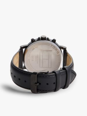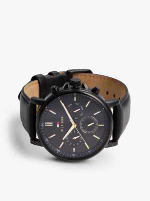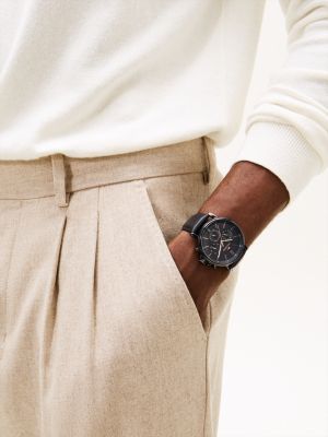 Cette montre à bracelet en cuir redouble d'élégance avec ses détails en plaqué or qui contrastent avec le cadran noir.