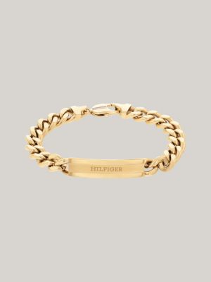 Il bracciale placcato oro è caratterizzato dall'accattivante design, con lucide maglie intrecciate e logo inciso sulla placchetta al centro.