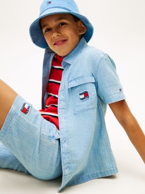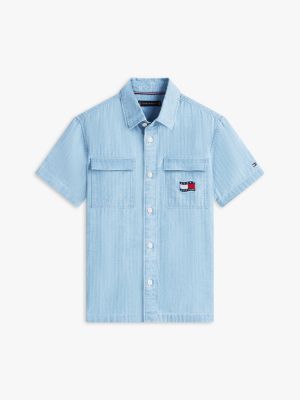 La camicia a maniche corte, realizzata in denim con trama a spina di pesce e completata dall'originale bandierina ondulata, aggiunge una nota western ai look.