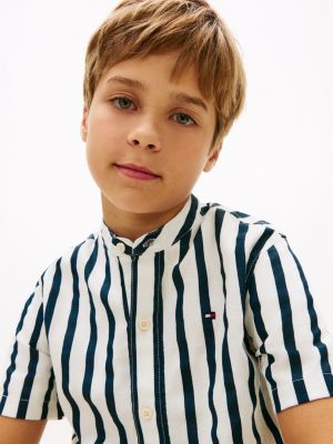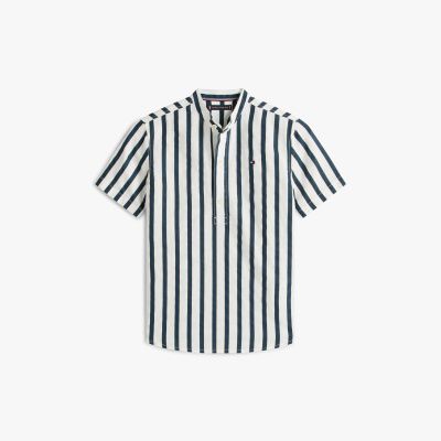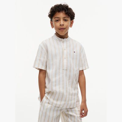 Il tessuto in misto lino, il colletto alla coreana e il motivo a righe all over infondono alla camicia un esclusivo stile da vacanza.