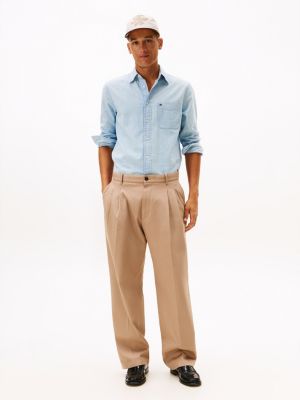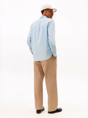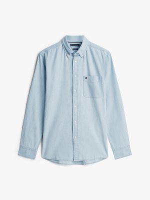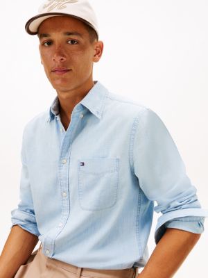 La camicia con colletto button down, realizzata in puro cotone chambray per un effetto texture, è impreziosita completata dall'iconica bandierina ricamata.