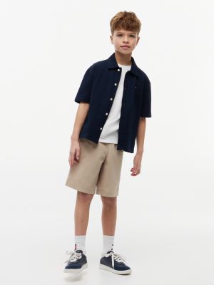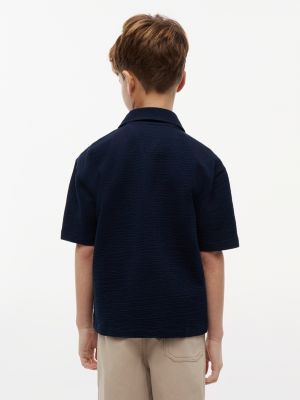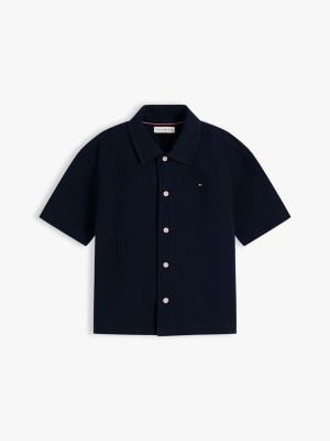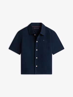La camicia relaxed fit a maniche corte, realizzata in jersey di misto cotone con texture in seersucker, è un capo essenziale per le vacanze.