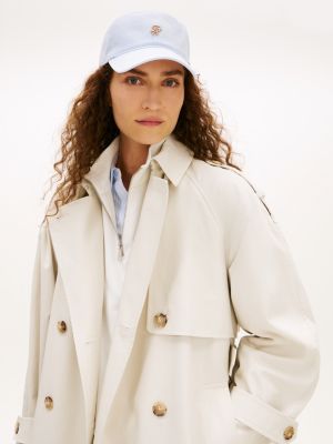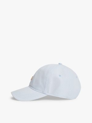 Il cappello da baseball, realizzato in morbido seersucker di puro cotone con motivo a righe verticali, è valorizzato dalla placchetta con logo in corsivo per un tocco davvero iconico.