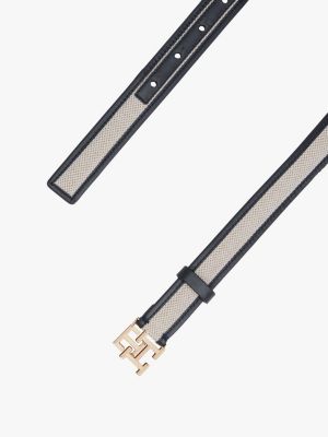 Aggiungi una nota iconica ai look casual grazie alla cintura bicolore in pelle martellata e tela, completata dall'esclusiva fibbia con monogramma TH.