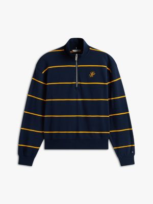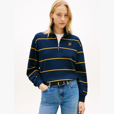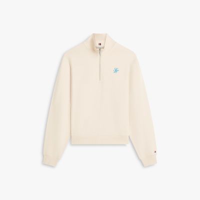 La felpa in spugna è un must have per gli outfit del fine settimana, grazie al design con mezza zip e all'esclusivo ricamo con il logo in corsivo.
