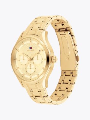 Il distintivo orologio in acciaio inossidabile placcato oro a ioni, con quadrante effetto solare, è completato dai tre contatori che donano una nota sportiva.