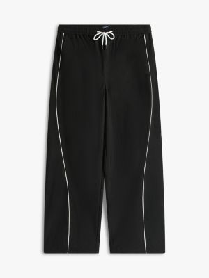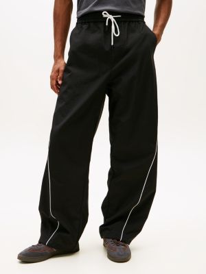 I pantaloni larghi in stile paracadutista, resistenti all'acqua e al vento, si distinguono per i dettagli a contrasto e la silhouette di ispirazione anni 2000.