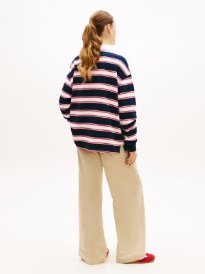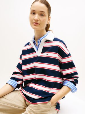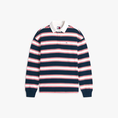 La comoda polo rugby, con spalle scese e righe iconiche, fonde alla perfezione stile athleisure e moda streetwear.