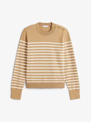 Il pullover in maglia di medio spessore, realizzato in jersey di puro cotone pettinato, ha uno stile classico sempre di tendenza, grazie ai bottoni dorati con branding sulla spalla.