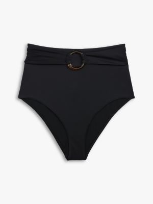I classici slip bikini, realizzati in tessuto tecnico di nylon stretch, si distinguono per la vita alta arricchita dall'accattivante dettaglio con anello.