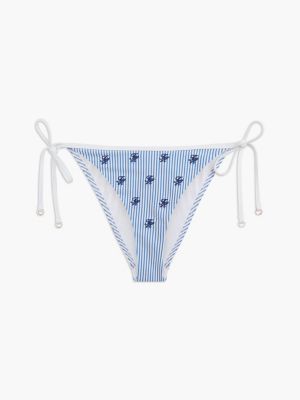 Gli slip bikini sono realizzati in tessuto seersucker dalla particolare texture, con i laccetti sui lati per regolarli a piacere.