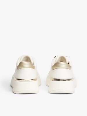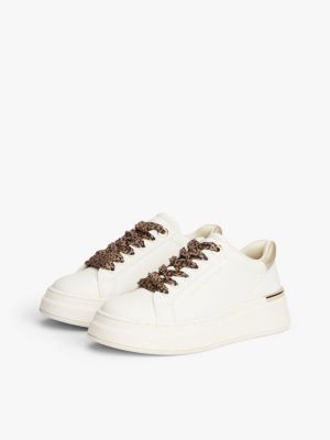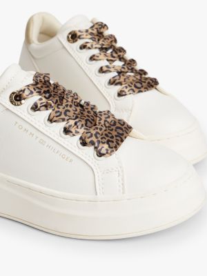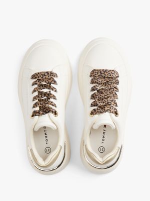 Le sneakers con suola alta donano un tocco originale agli outfit, grazie ai lacci con stampa leopardata e ai dettagli metallizzati.