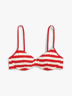 Il top bikini a mezza coppa è il protagonista indiscusso dei tuoi look per la spiaggia, con la texture a coste e il vivace motivo a righe orizzontali in stile rétro.