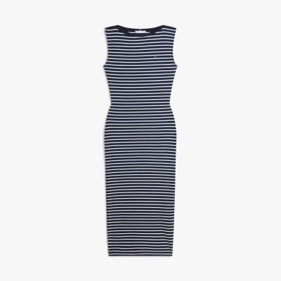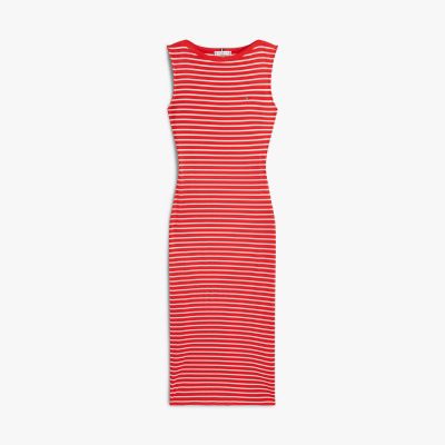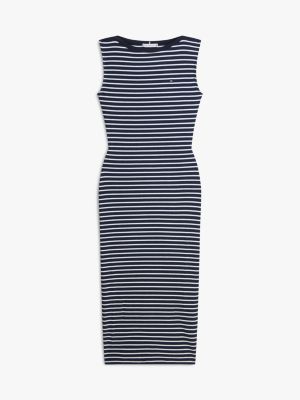 Il vestito midi aderente in tessuto a coste, con la raffinata bandierina ricamata, si distingue per la scollatura a barca e il design senza maniche.