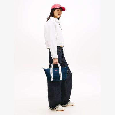 • Tommy Jeans-Serifen-Schreibschrift-Logomuster an Tragegriffen oben