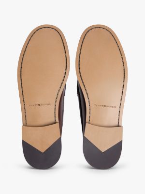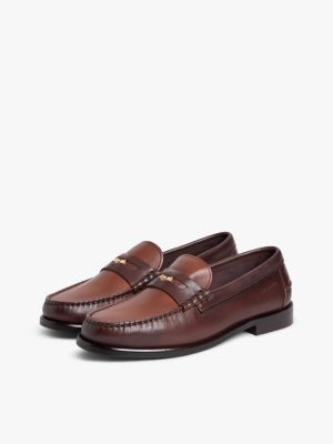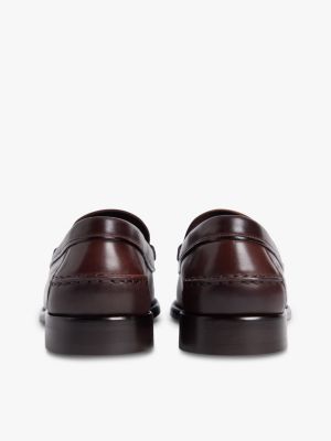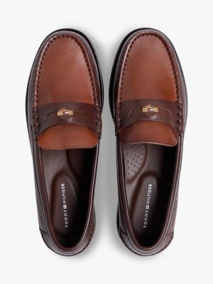 Perfektioniere deine eleganten Looks dank diesem klassischen Loafer aus glänzendem Leder, der vorne einen goldfarbenen Penny mit Branding hat.