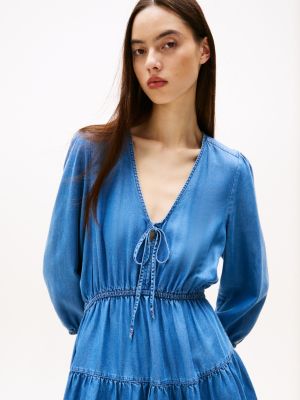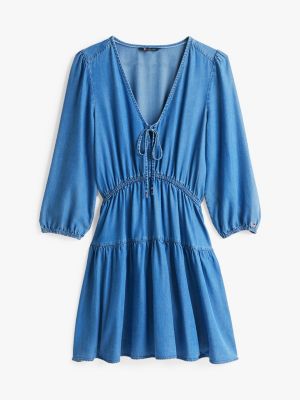 Der Stufenrock und die figurnahe Passform sorgen bei diesem Minikleid für einen femininen Denim-Look.