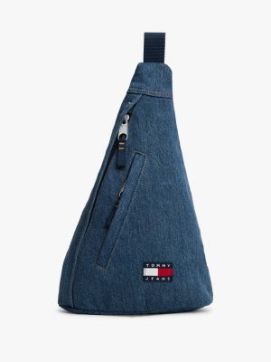 Für Retro-Vibes sorgt diese Sling Bag aus Rigid Denim im sportlichen Design mit einem Riemen und Badge.