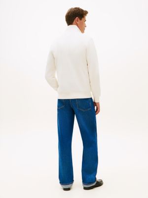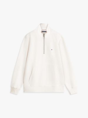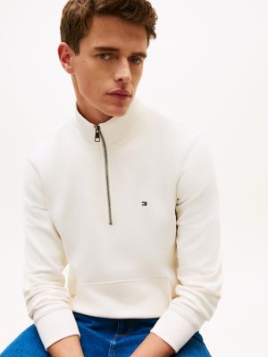 Kombiniere diesen Terry-Pullover mit Trichterkragen, Kängurutasche, Flag-Stickerei und Viertel-Reißverschluss an kühlen Tagen im lässigen Lagen-Look.